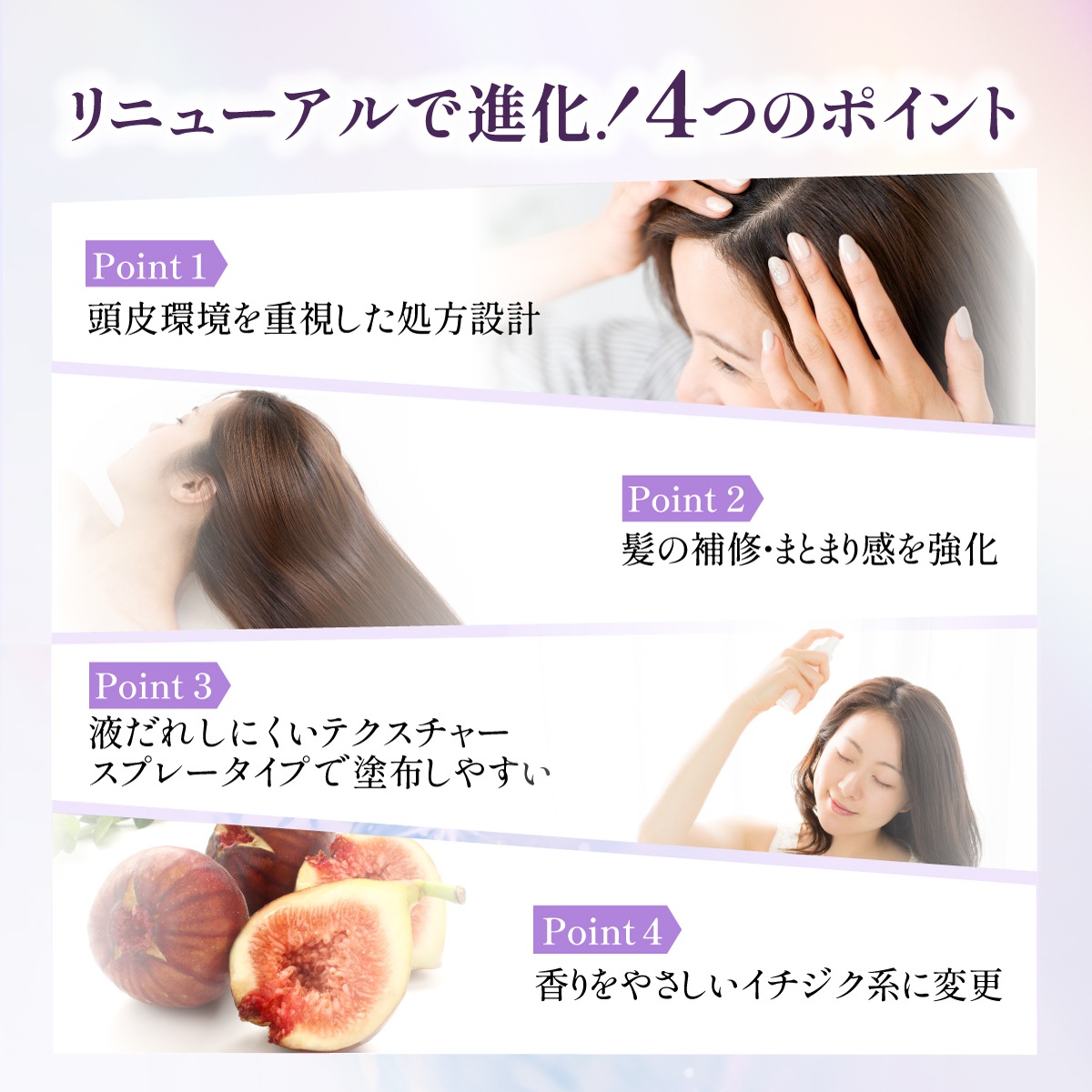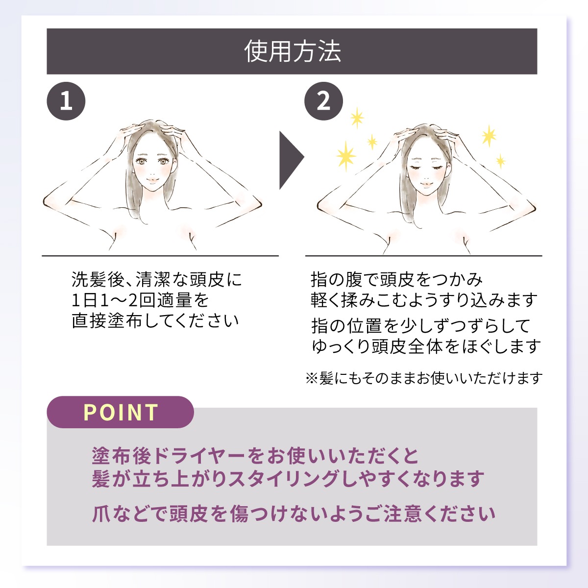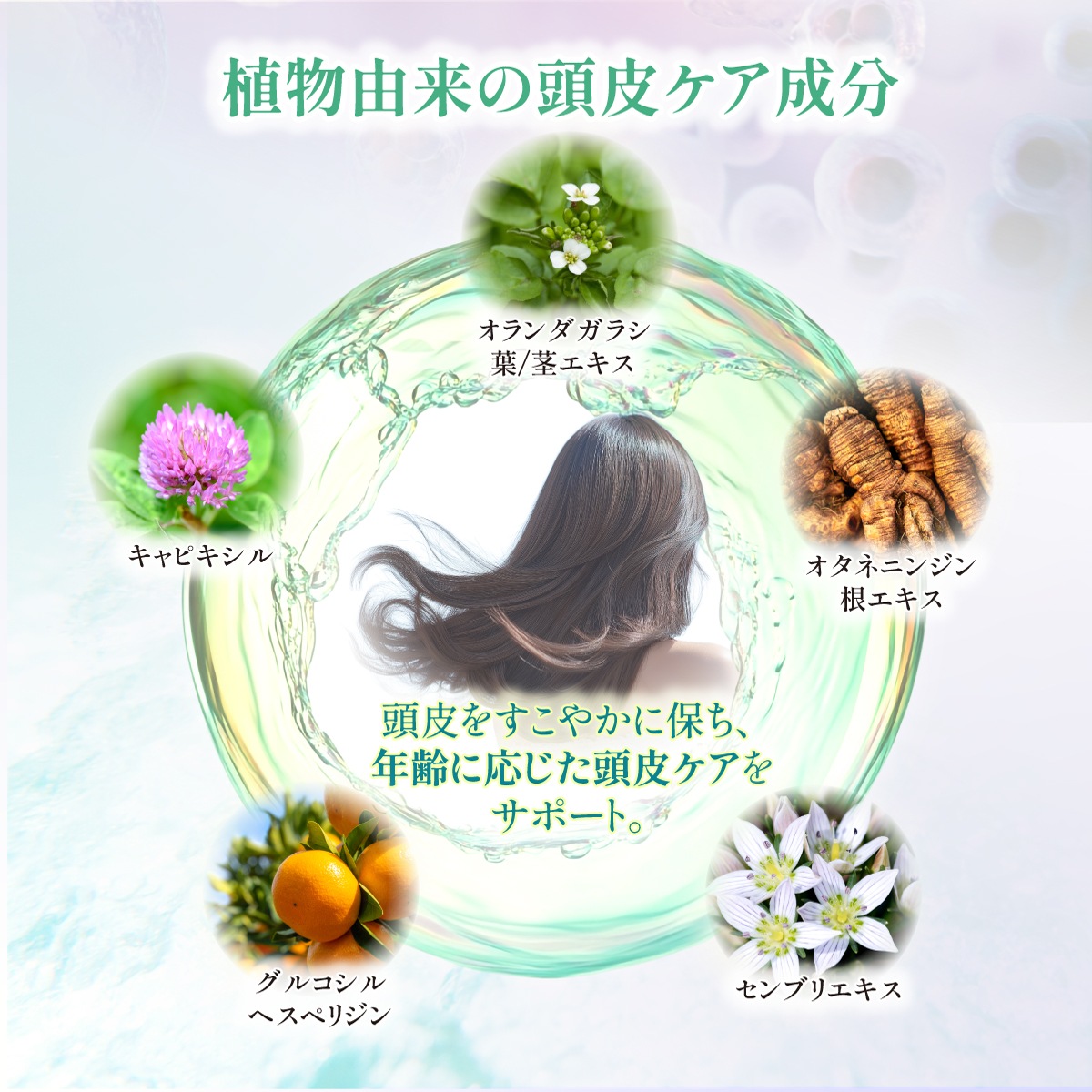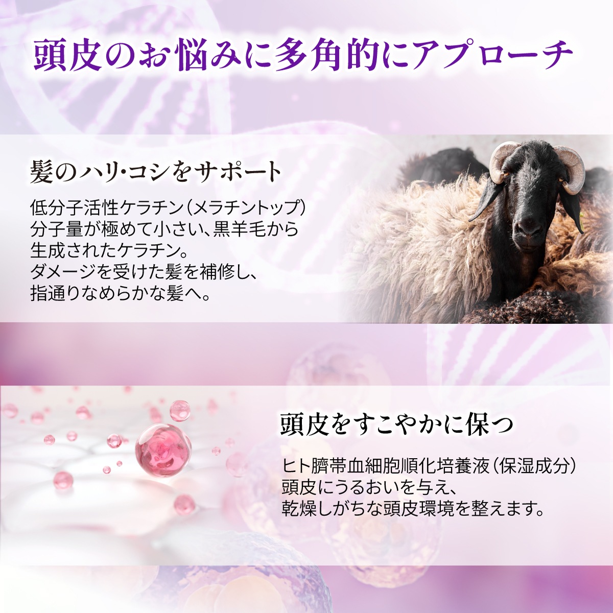 【全成分】水、BG、エタノール、(PEG-240/デシルテトラデセス-20/HDI)コポリマー、加水分解ケラチン(黒羊毛)、ヒト臍帯血細胞順化培養液、オタネニンジン根エキス、オランダガラシ葉/茎エキス、センブリエキス、アカツメクサ花エキス、アセチルテトラペプチド-3、グルコシルヘスペリジン、デキストラン、アルギニン、トコフェロール、水添レシチン、EDTA-2Na、ラウリン酸K、PEG-60水添ヒマシ油、カプリル酸グリセリル、ペンチレングリコール、フェノキシエタノール、香料