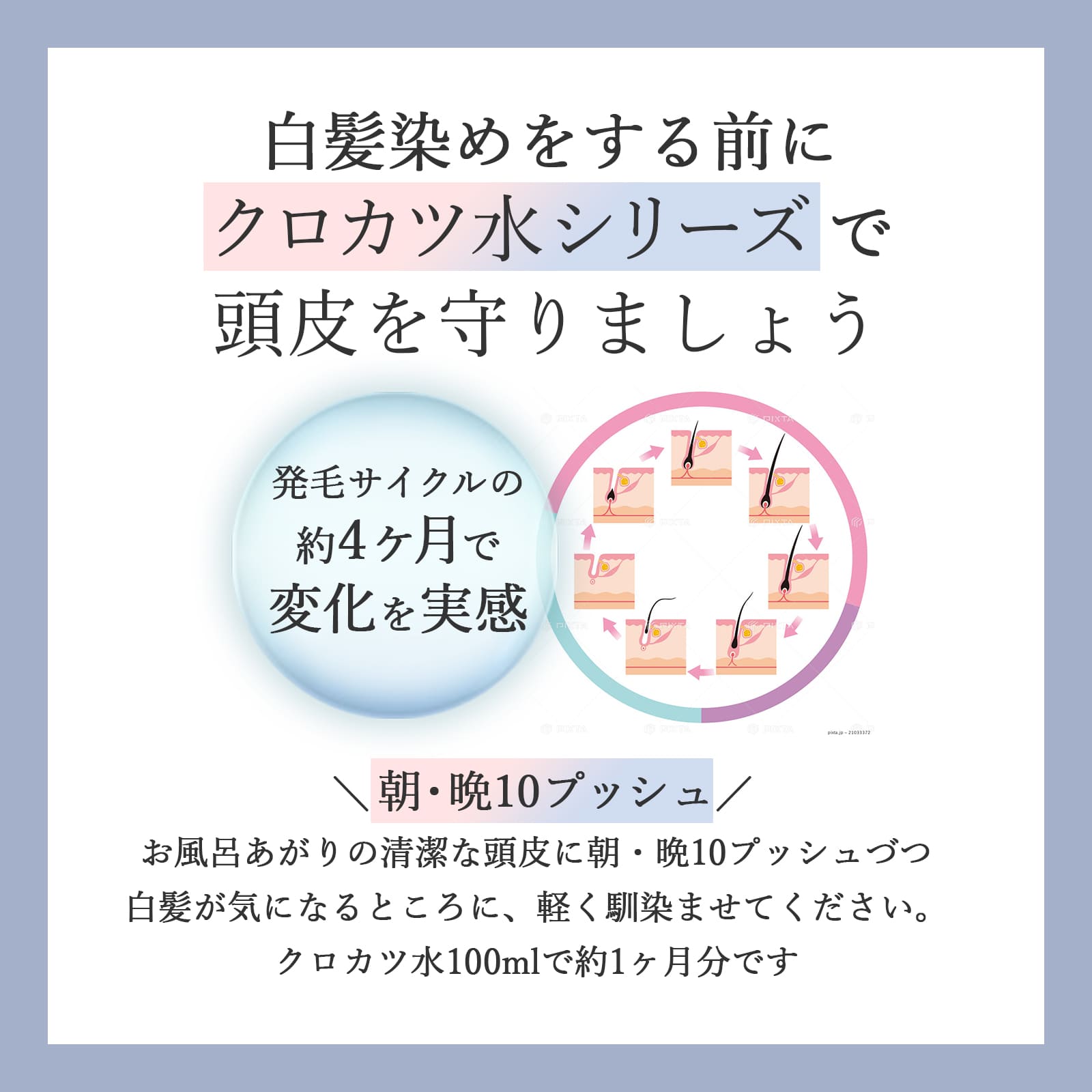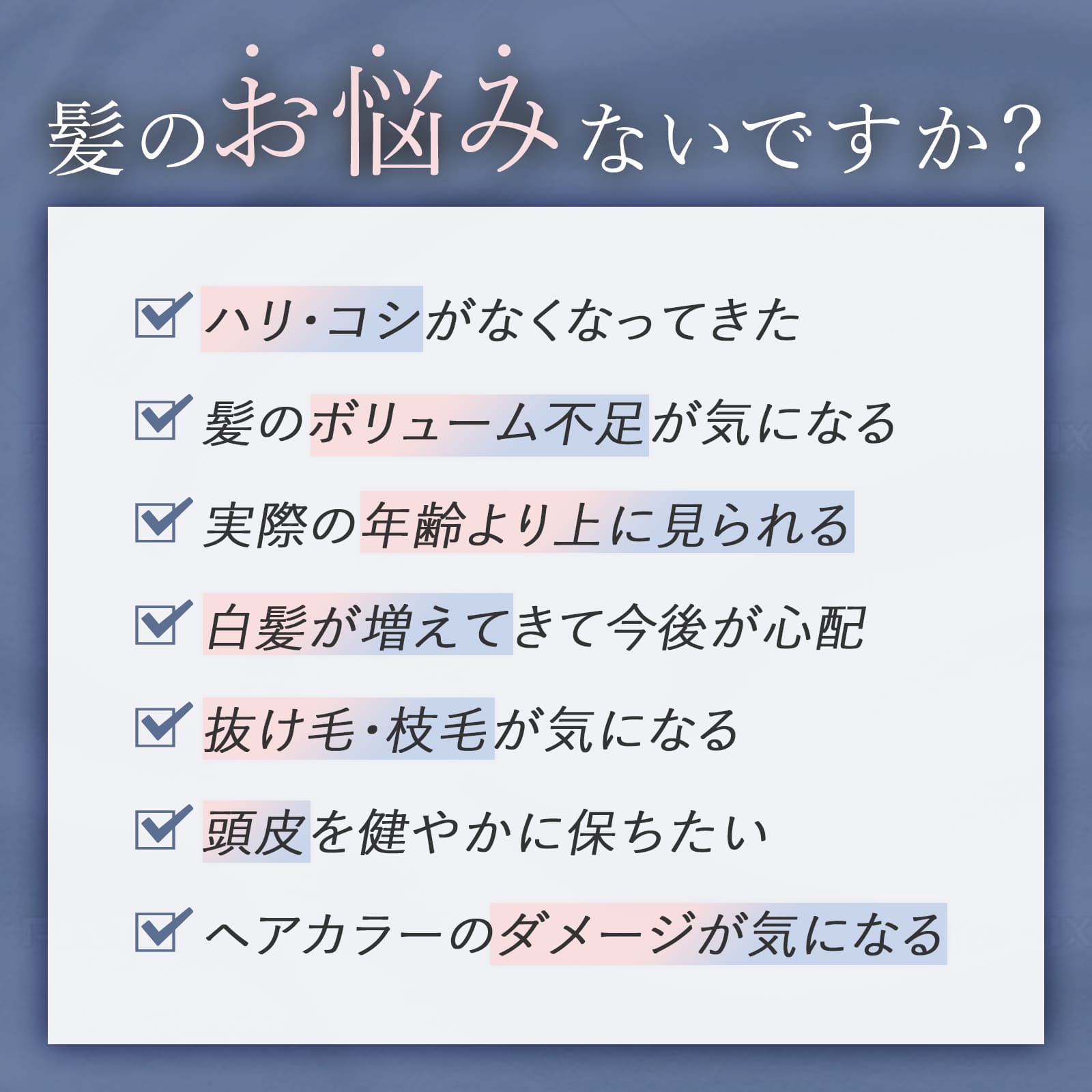 - 白髪が生え始めた方や、白髪染めの回数が増えてきた方におすすめ。ダークニルとシナチントップが頭皮環境を整えます。