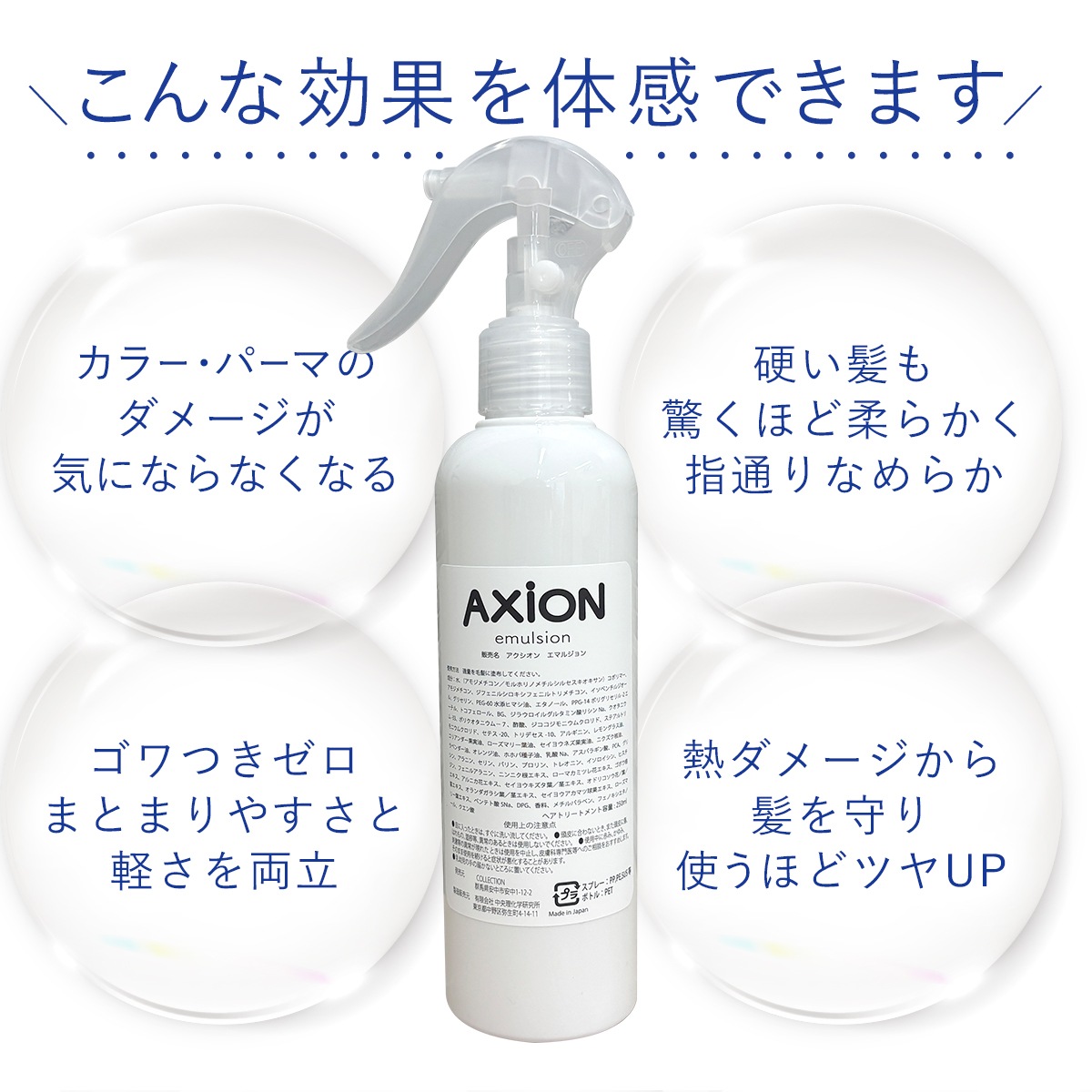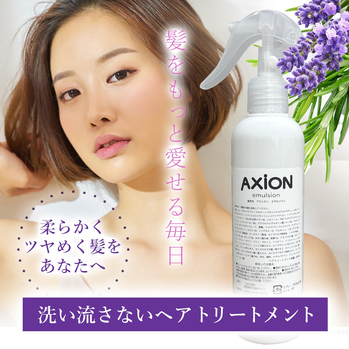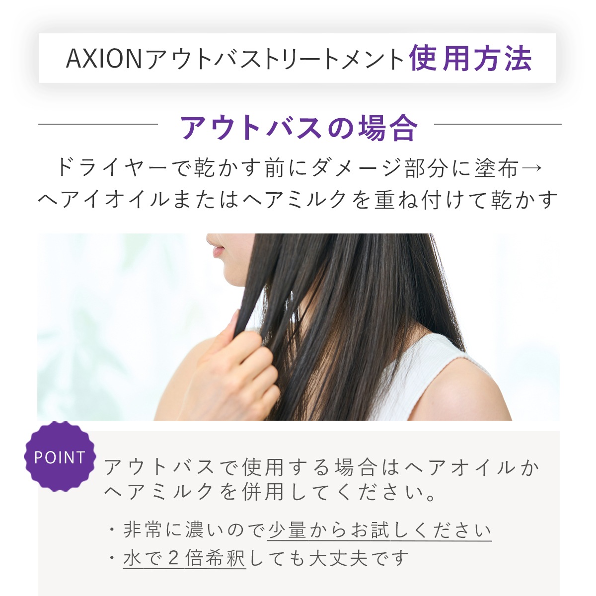 - :アウトバスで使用する場合は、アクシオンを付けた後にヘアオイルやヘアミルクを併用してご使用ください。